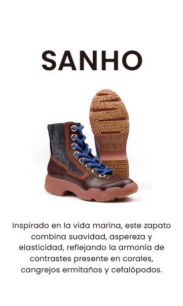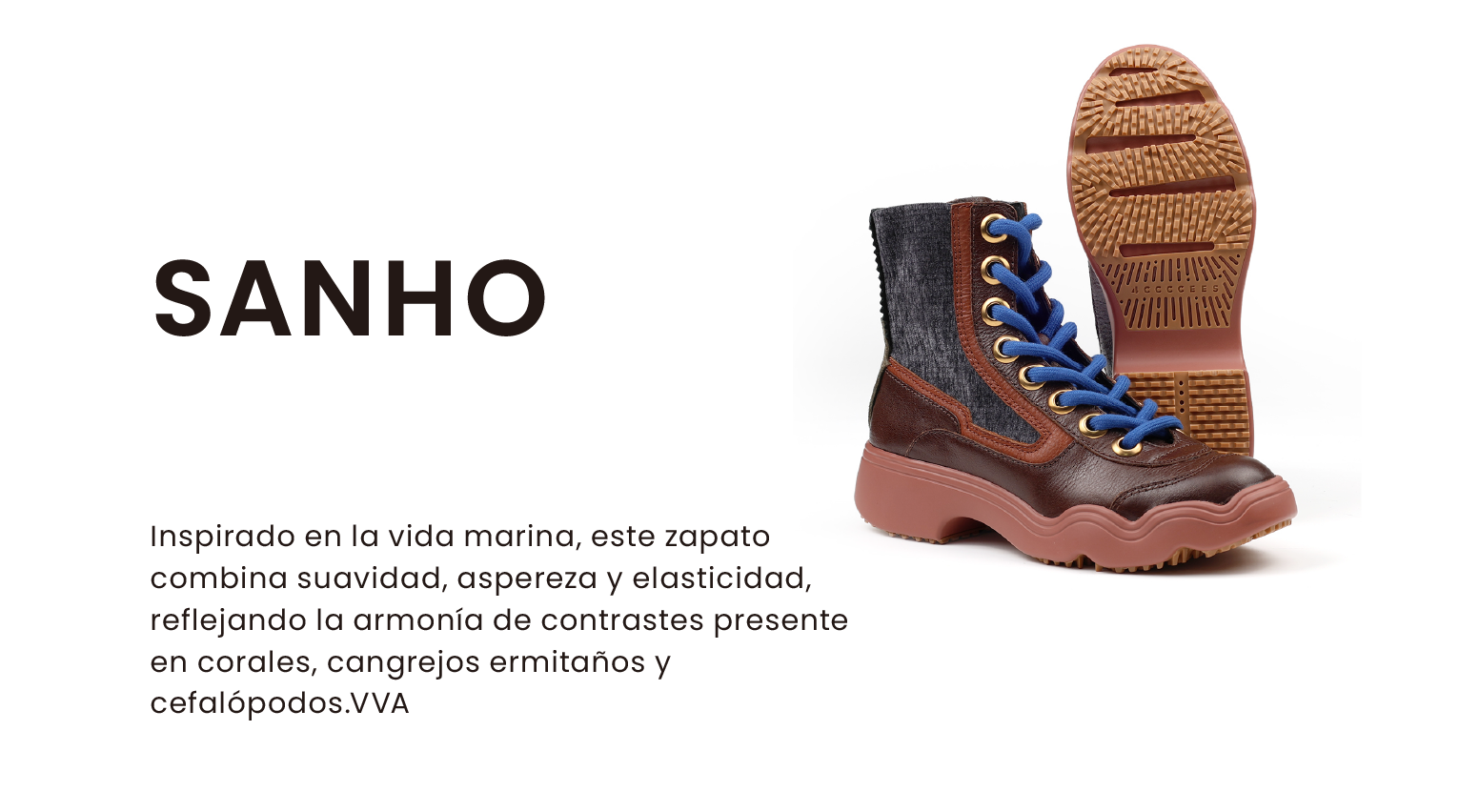 Un zapato suave y funcional donde las sensaciones táctiles se expresan de forma visual. Inspirado en las texturas contrastadas y las formas orgánicas de la vida marina, la diseñadora de 4CCCCEES bautizó este modelo como SANHO, que significa “coral” en coreano. La suela imita la curva natural del pie y de la pisada. Las protuberancias rugosas, similares al coral, no solo evocan el aspecto y la sensación de las superficies submarinas, sino que además ofrecen un agarre, flexibilidad y durabilidad excepcionales. Esta bota fusiona la estética de combate con la funcionalidad del clásico botín Chelsea. El cordón grueso de algodón permite que la Sanho Curla se ajuste de forma estilizada y cómoda. La combinación de pieles y paneles elásticos de terciopelo refuerzan el carácter lúdico y sensorial propio de 4CCCCEES.