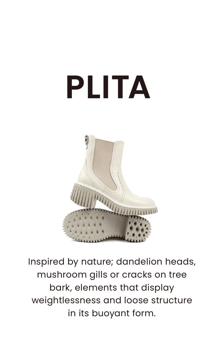 Taking its cue from a heavy lug sole and exaggerated proportions, PLITA’s buoyant form alludes to natural elements such as dandelion heads, mushroom gills, or the cracks of tree bark where loose structural components come together as one. Its foamed rubber outsole is lightweight, flexible, and voluminous (a 60mm heel with a 20mm platform), culminating in a modern, fresh, and comfortable appeal.